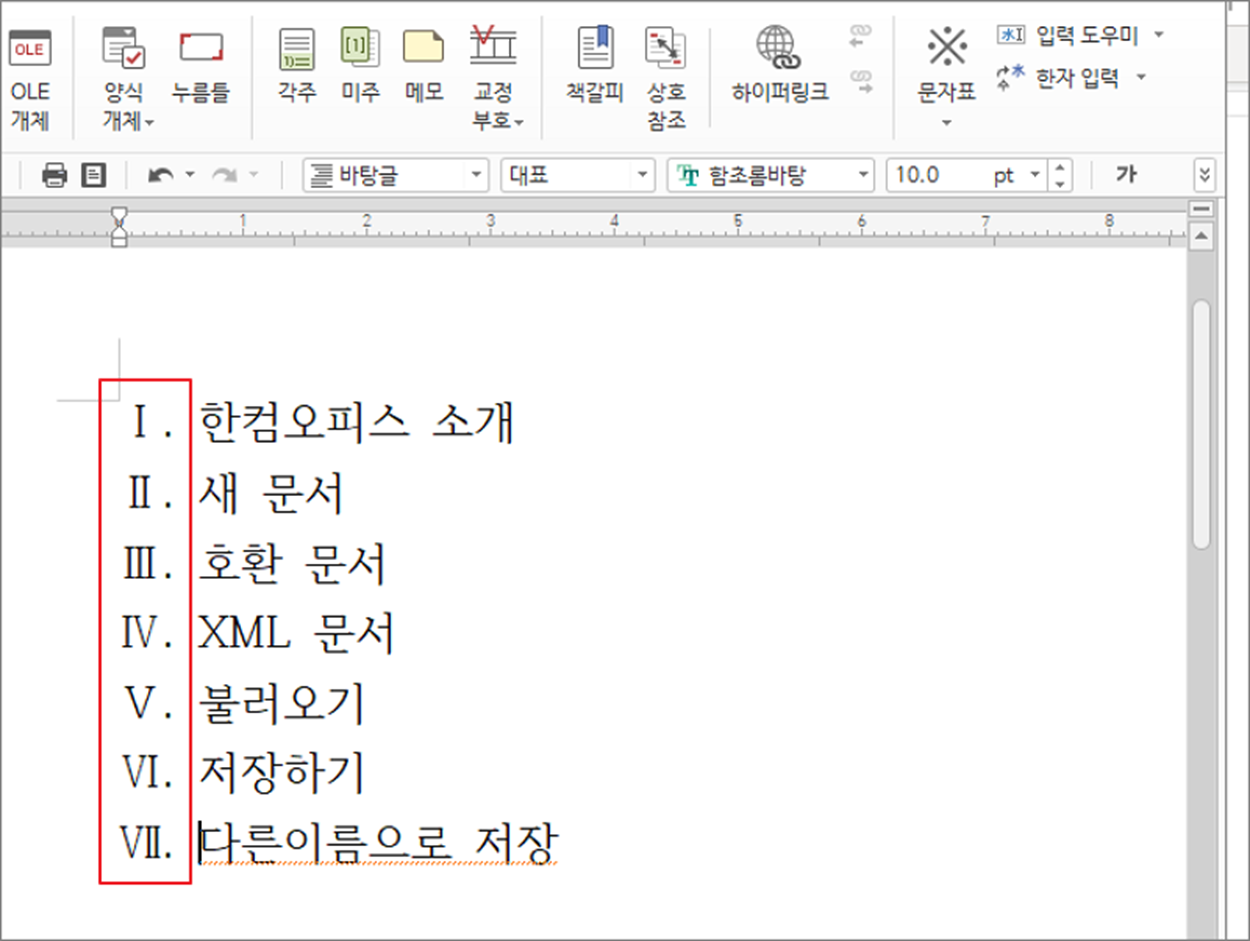 ▼ 문단 앞에 커서를 두고 로마숫자를 순서대로 하나씩 추가해서 목차를 만들어 보세요.