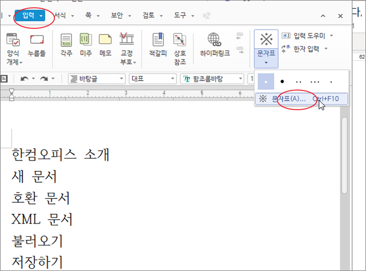 ▼ 다음은 특수문자표를 통해 로마숫자로 목차를 만들어 보겠습니다. 입력 탭 > 문자표 > 문자표 리본 메뉴를 클릭합니다.
