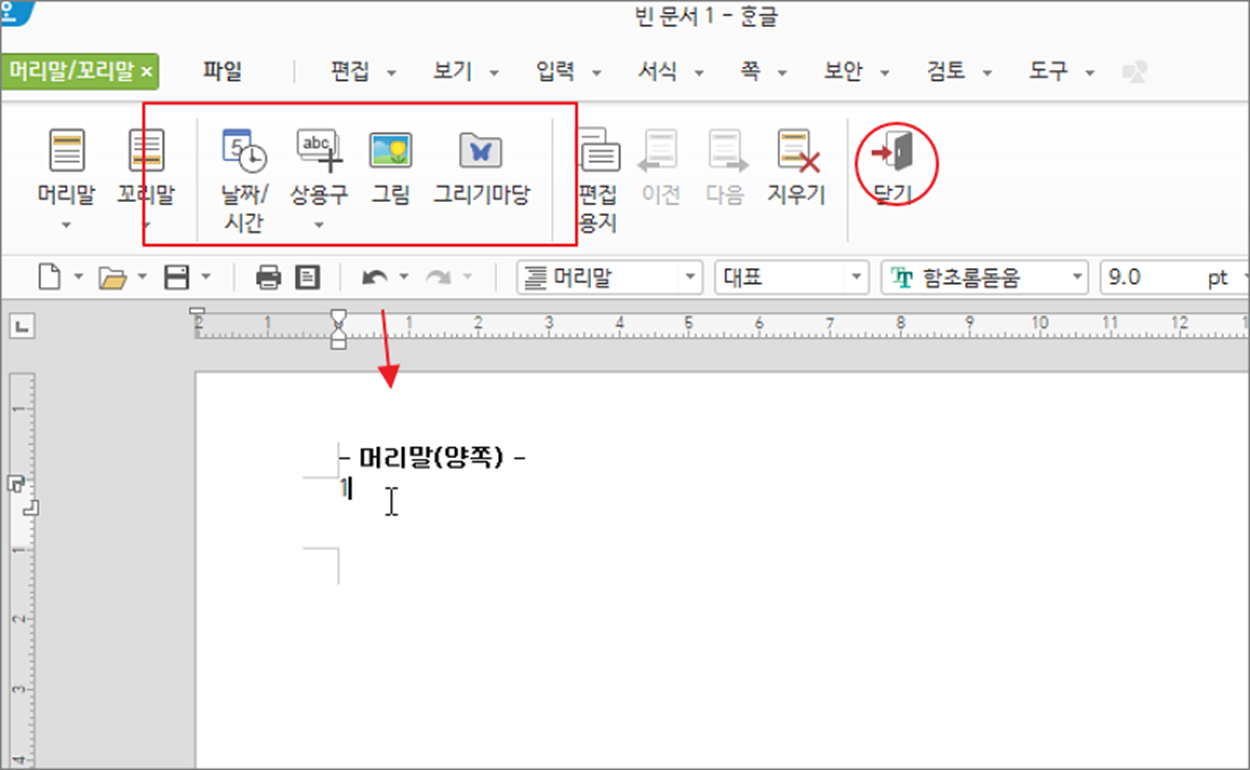 ▼ 머리말 영역을 더블 클릭하는 순간 상단 여백은 편집 가능한 영역으로 바뀝니다. 그리고 상단에는 머리말/꼬리말 탭이 나타납니다. 이곳에 각종 편집 메뉴들을 제공하고 있습니다. 머리말 편집 화면을 닫고 싶다면 탭에서 오른쪽 끝에 닫기 버튼을 클릭해야 합니다.