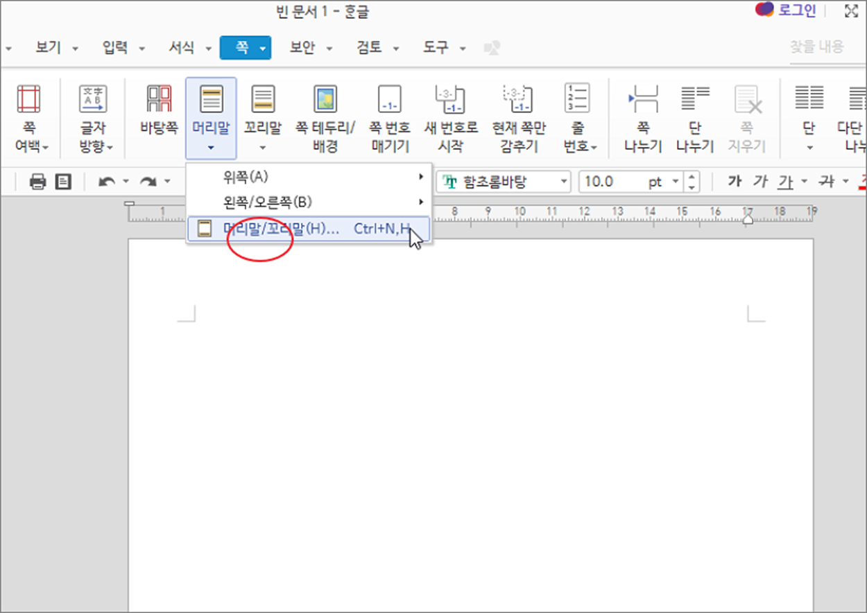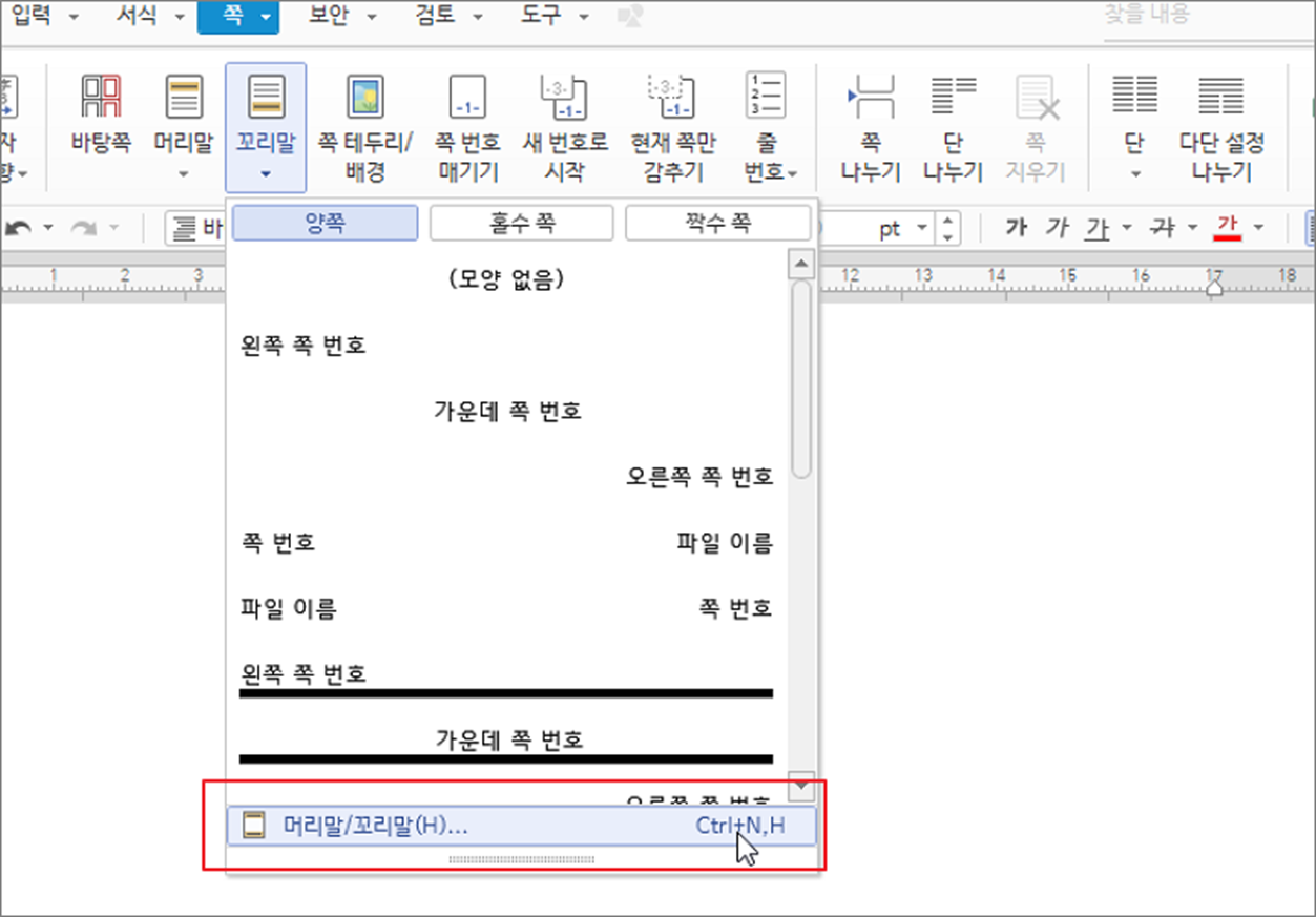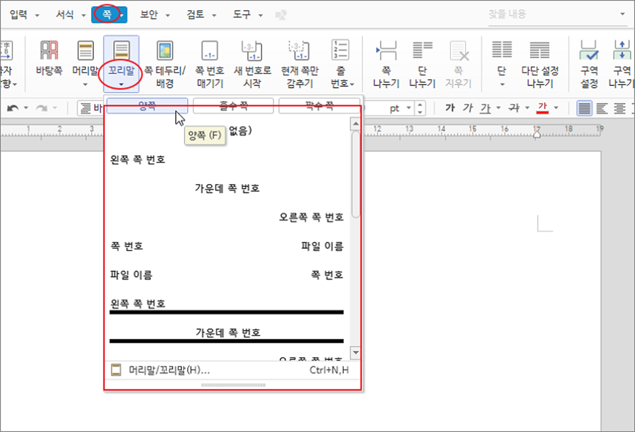 ▼ 다음은 꼬리말입니다. 메뉴는 쪽 탭 > 꼬리말 입니다. 하위에는 꼬리말 샘플 목록과 머리글/꼬리말 메뉴가 있습니다.