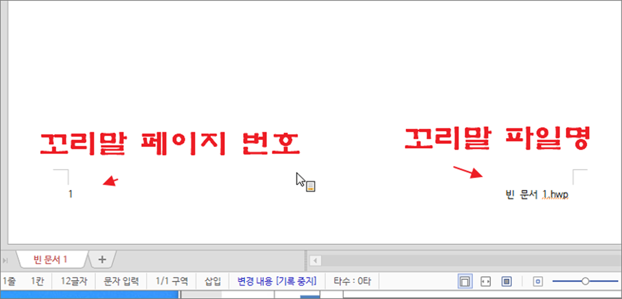 ▼ 쪽 번호, 파일 이름 항목을 클릭해서 머리말을 추가해 보았습니다. 그림처럼 양쪽으로 쪽 번호와 파일명이 자동으로 추가된 것을 알 수 있습니다.