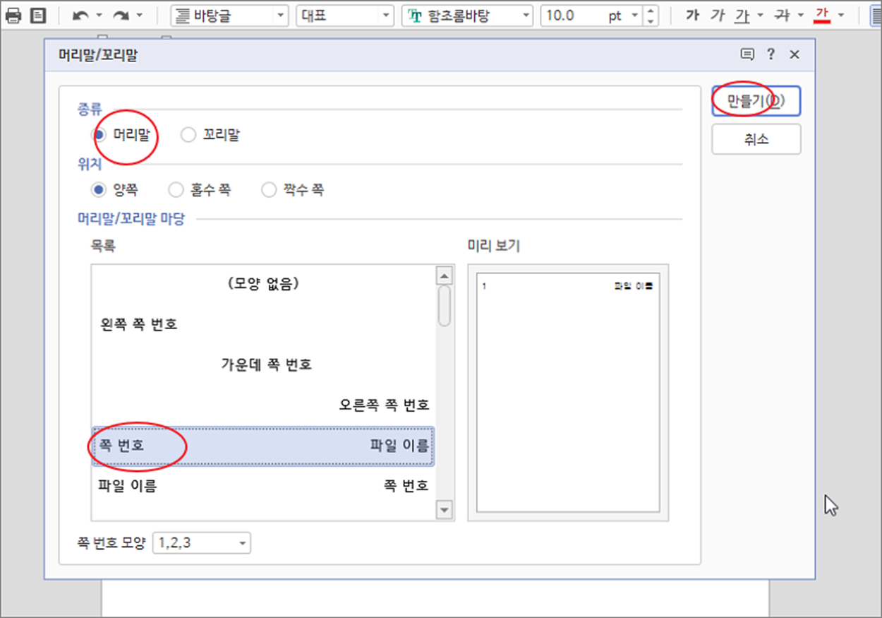 ▼ 머리말/꼬리말 팝업창에서 머리말을 선택하고 아래 목록에서 모양을 지정합니다. 다음 오른쪽 상단으로 가서 만들기 버튼을 클릭합니다.