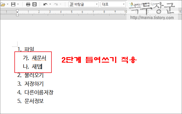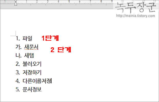 ▼ 1단계 다음에 수준을 낮춘 2단계 메뉴는 "가" 와 "나" 가 붙었습니다. 다음 1단계인 번호 2 를 시작합니다. 이렇게 하위 메뉴가 있다면 수준을 낮춰서 문단 번호를 붙일 수 있습니다. 그런데 2단계 메뉴의 들여쓰기가 안되어 있어서 구분이 잘 가지 않습니다. 단계별 들여쓰기를 적용하기 위해서는 사용자 정의 문단 번호를 생성해서 적용해야 합니다.