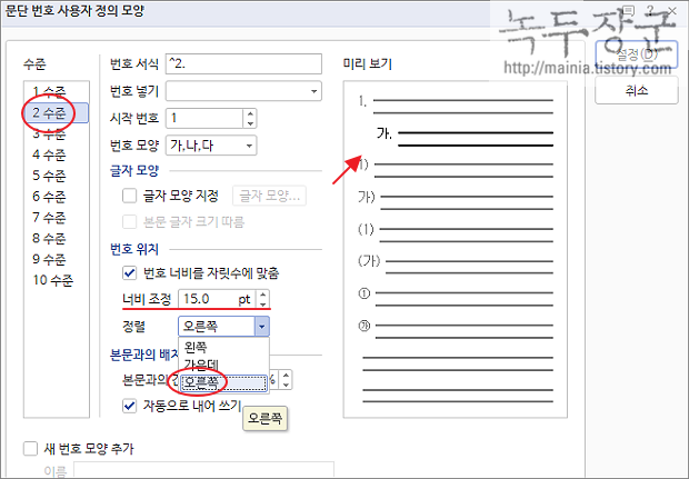 ▼ 사용자 정의 화면에서 2단계 수준을 선택합니다. 2단계의 들여쓰기 수정을 위해 번호 위치 항목으로 이동합니다. 너비 조정 값을 미리 보기를 보면서 조절합니다. 다음 정렬을 왼쪽에서 오른쪽으로 변경합니다. 그래야 글 머리에 붙는 문단 번호도 같이 움직이기 때문입니다.