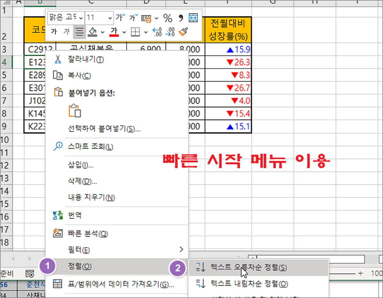 ▼ 리본 메뉴가 아닌 오른쪽 마우스를 클릭하면 나타나는 빠른 시작 메뉴를 이용할 수도 있습니다. 정렬 메뉴를 선택하면 오름차순/내림차순 메뉴가 나타납니다.