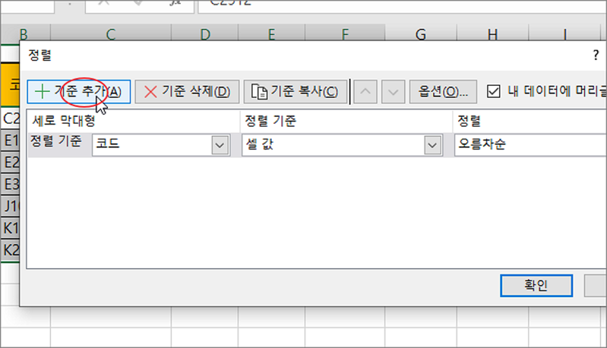 ▼ 정렬 기준을 설정하는 창이 뜨면 상단 메뉴에서 기준 추가 버튼을 클릭합니다.