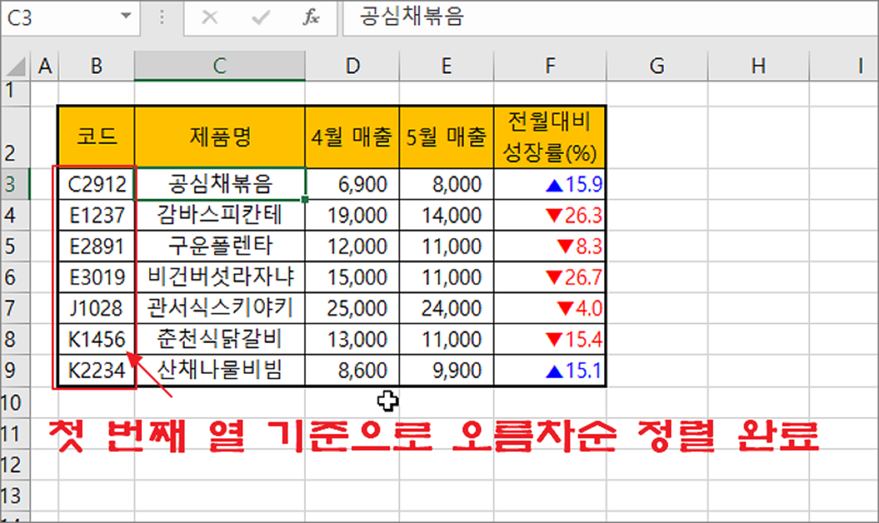▼ 결과는 다음과 같습니다. 첫 번째 열을 기준으로 오름차순 정렬을 완료했습니다.