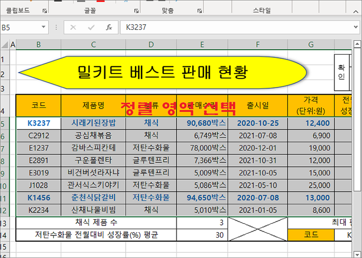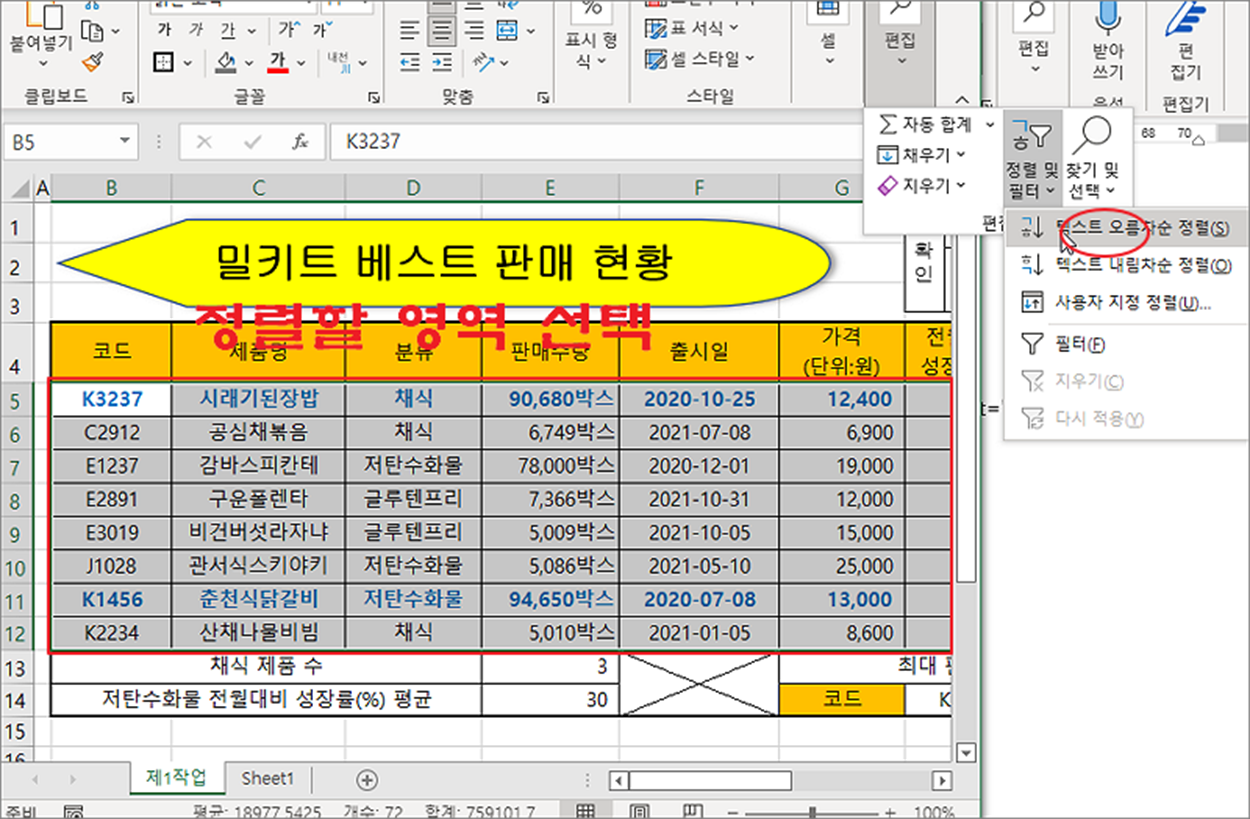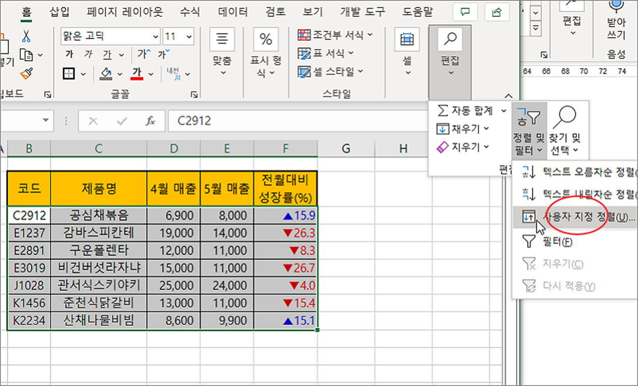 ▼ 정렬의 기준은 영역에서 첫 번째 열입니다. 샘플에서는 “코드” 열이 기준입니다. 여기에서 “제품명” 열을 추가해서 다중 정렬을 하고 싶다면 어떻게 해야 할까요? 홈 탭 > 편집 > 정렬 및 필터 > 사용자 지정 정렬 메뉴를 선택합니다.