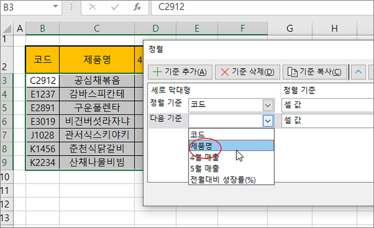 ▼ 다중 정렬 기준 추가를 위해 두 번째 기준인 “제품명” 을 선택합니다.