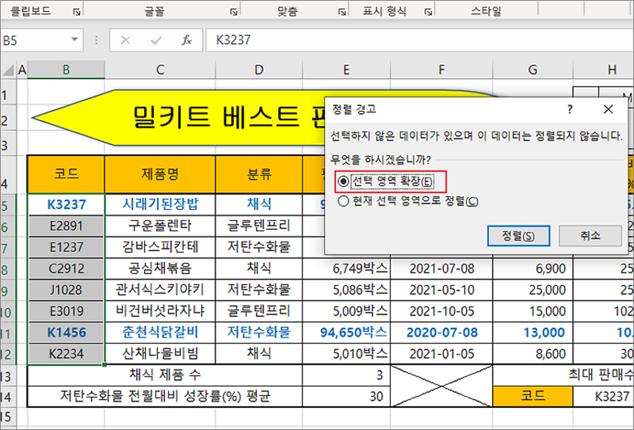 ▼ 다음은 정렬 과정에서 일반적으로 발생하는 오류를 알아보겠습니다. 정렬에서 일부 셀을 선택하고 선택 영역 확장 옵션을 지정하는 경우입니다.