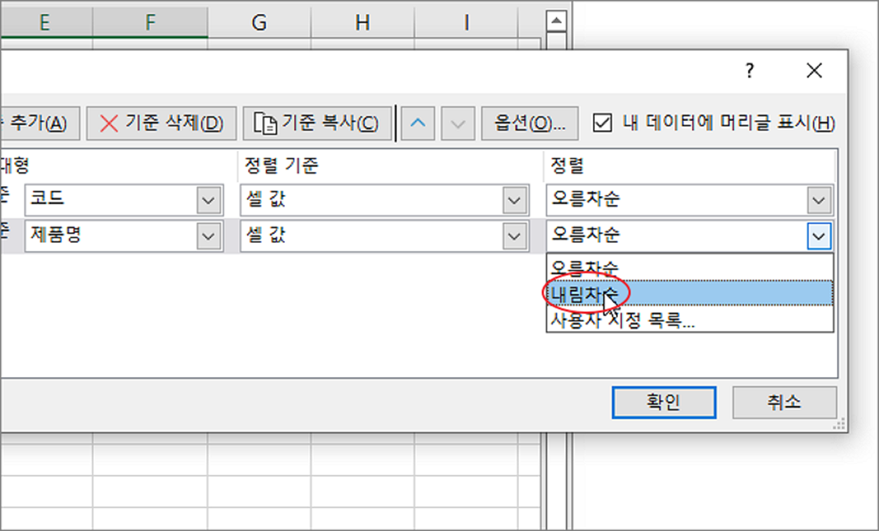 ▼ 두 번째 기준이 되는 제품명의 정렬 옵션을 선택합니다.