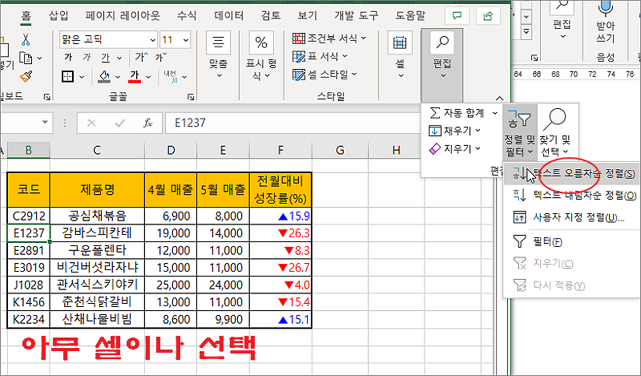 ▼ 표를 정렬하는 방법은 간단합니다. 표 형태로 정렬되어 있는 데이터인 경우 아무 셀이나 선택하고 홈 탭 > 편집 > 정렬 및 필터 > 텍스트 오름차순 정렬 메뉴를 클릭합니다.