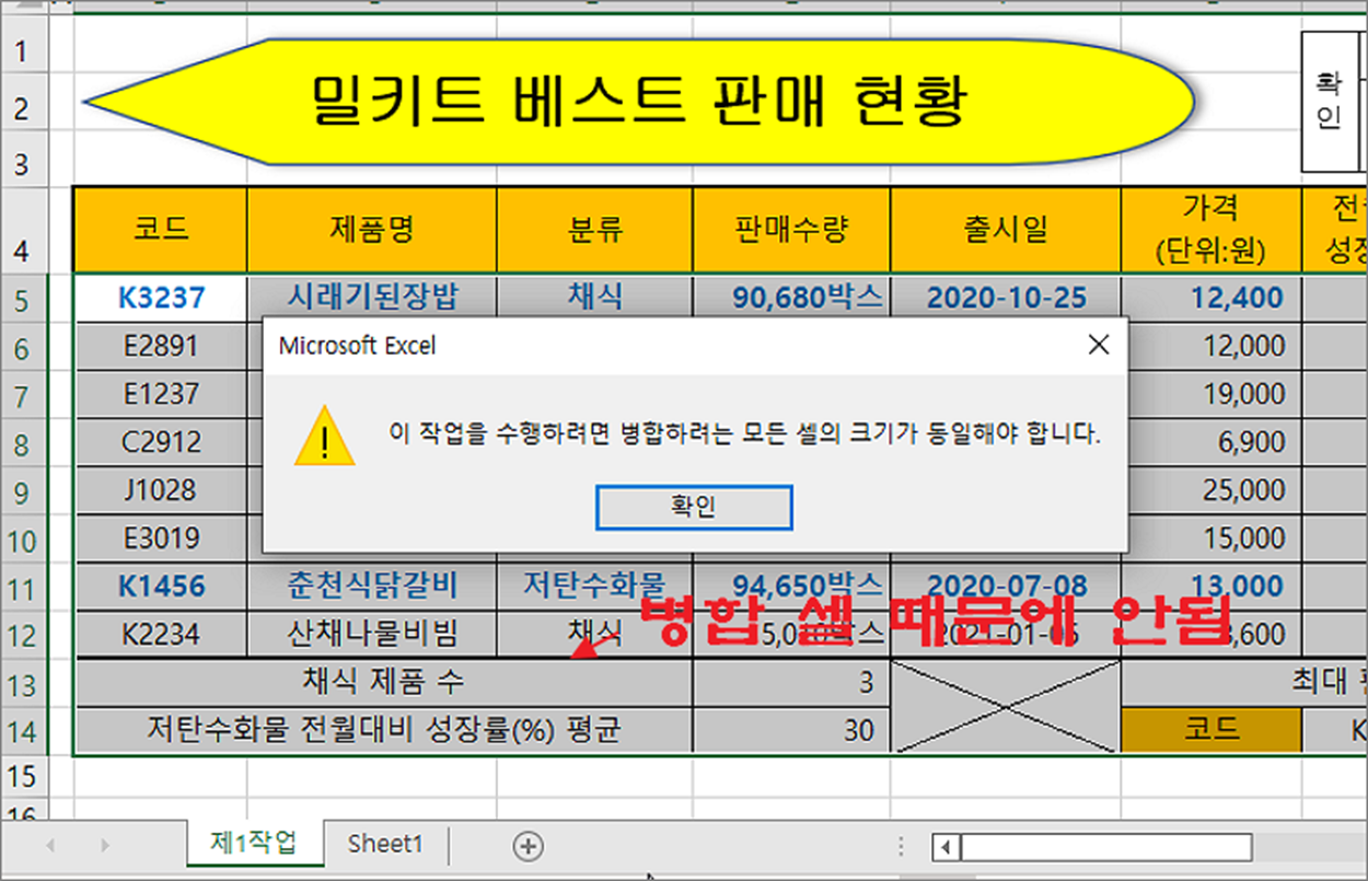 ▼ 그림처럼 표 전체를 확장했을 때 “모든 셀의 크기가 동일해야 합니다.” 라는 메시지와 함께 정렬 오류가 발생합니다. 이것은 정렬 영역에 병합된 셀이 포함되어 있어야 발생하는 문제입니다. 이런 경우 정렬할 셀 모두를 선택하고 작업을 진행해야 합니다.