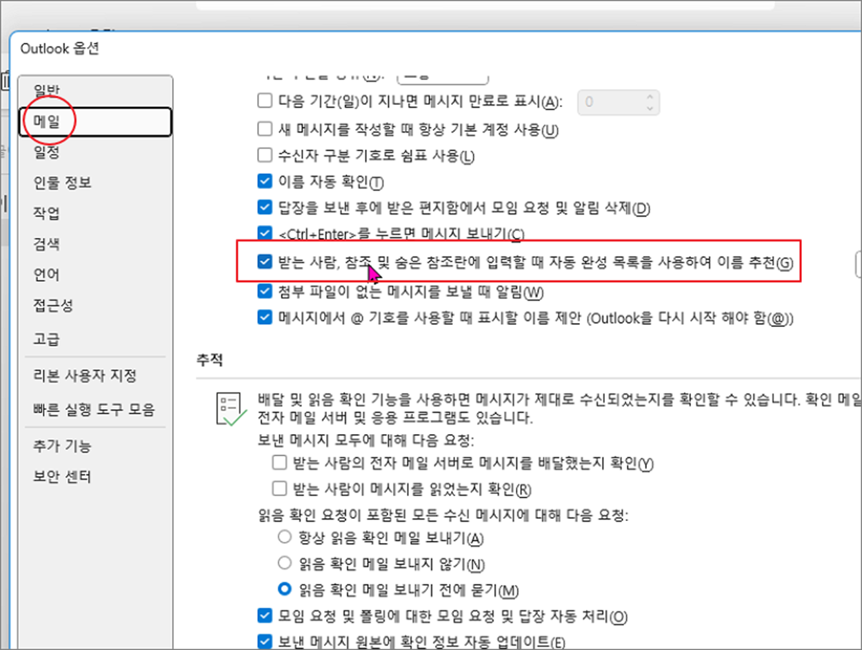 ▼ 옵션 창 왼쪽메뉴에서 “메일” 을 선택합니다. 그리고 오른쪽 화면에서 “메시지 보내기” 항목으로 가시면 “받은 사람, 참조 및 숨은 참조란에 입력할 때 자동 완성 목록을 사용하여 이를 추천” 옵션을 볼 수 있습니다. 여기에 체크가 되어 있기 때문에 자동완성이 되는 것입니다. 이 체크 항목 바로 옆으로 가시면 자동 완성 목록에 저장되어 있는 값을 지울 수 있는 버튼이 있습니다.