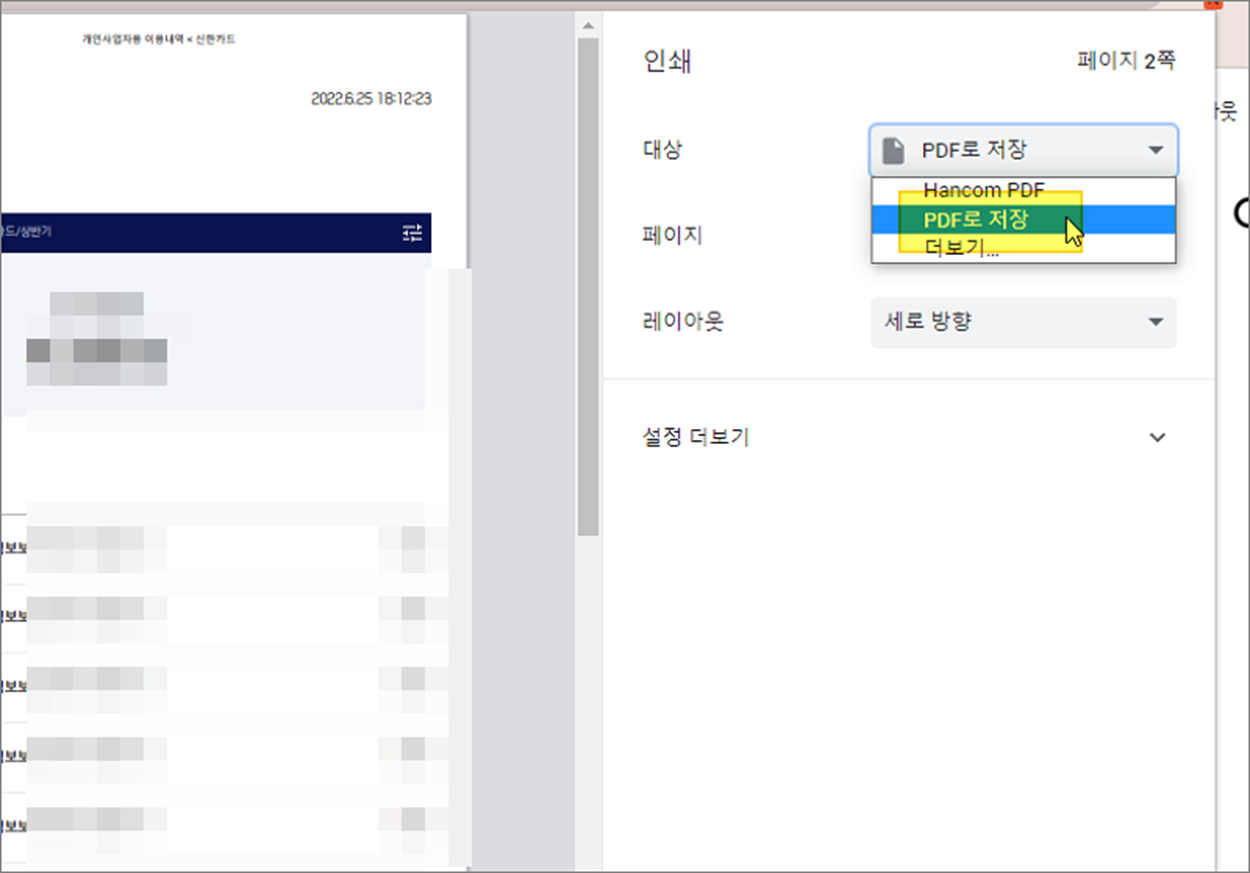 ▼ 인쇄 화면이 뜨면 오른쪽 대상 항목에서 “Hancom PDF” 나 “PDF 로 저장” 메뉴를 클릭합니다. 만약 그림과 같이 PDF 저장 메뉴가 보이지 않는다면 PDF 리더나 편집 관련 무료 프로그램을 다운받아 설치합니다.