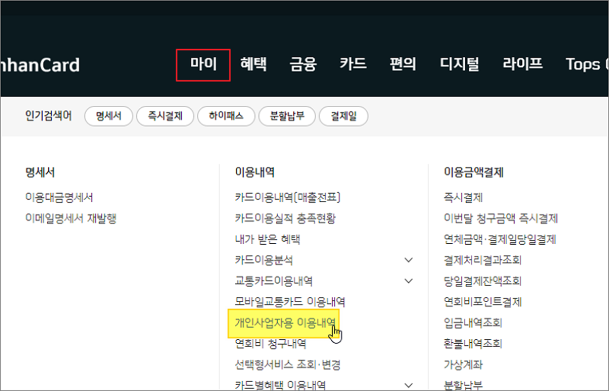 ▼ 우선 카드 이용 내역을 조회하는 메뉴를 알려드리겠습니다. 홈페이지에 접속한 후 상단 마이 > 이용내역 > 개인사업자용 이용내역 메뉴를 클릭합니다.