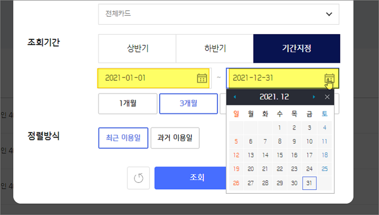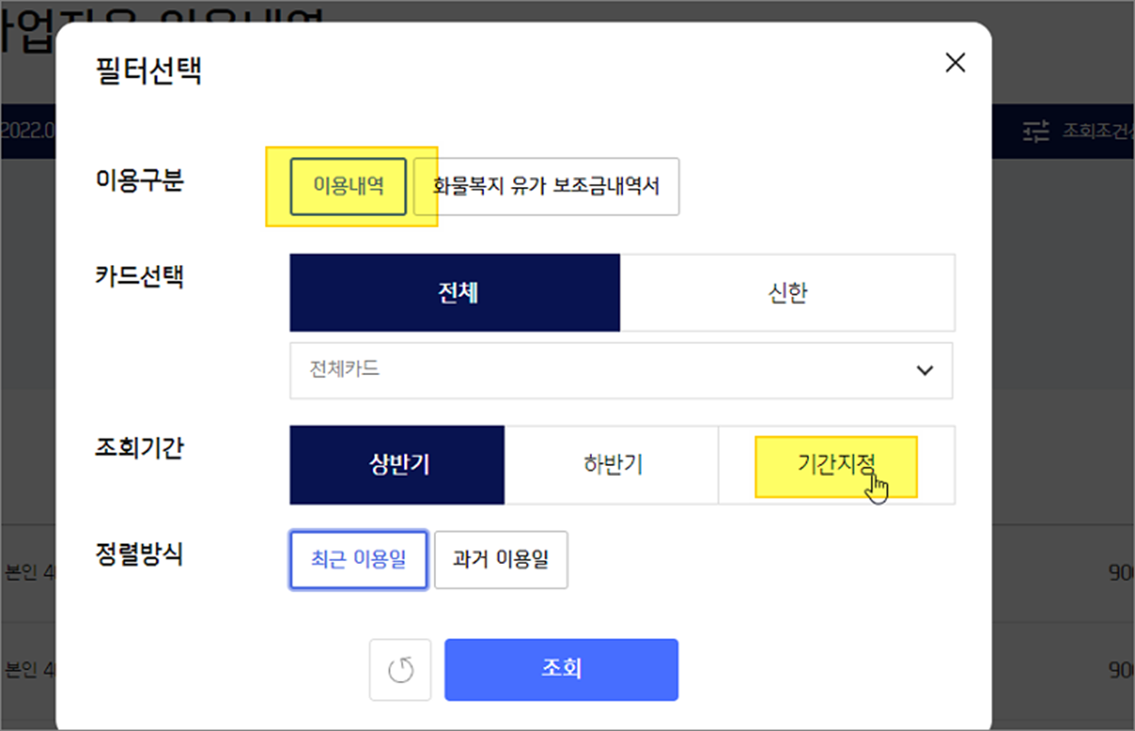 ▼ 새창에서 “이용구분” 을 “이용내역” 으로 하고 “조회기간” 을 “기간지정” 으로 변경합니다.