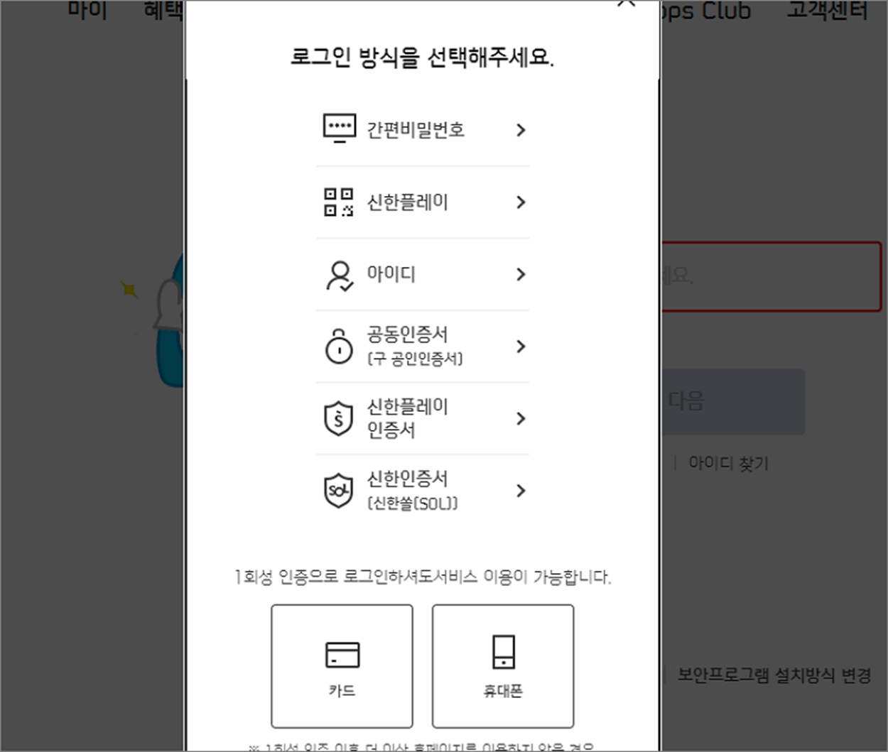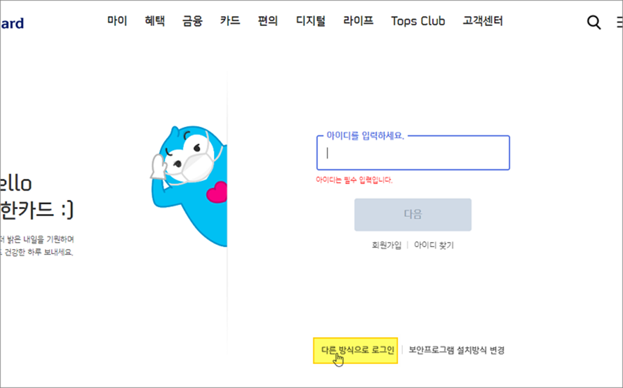 ▼ 다음 홈페이지 로그인을 해야 합니다. 신한카드는 다양한 로그인 방식을 제공하는데, 화면에 사용자가 원하는 방식이 아니라면 아래 “다른 방식으로 로그인” 버튼을 눌러 변경을 시도합니다.