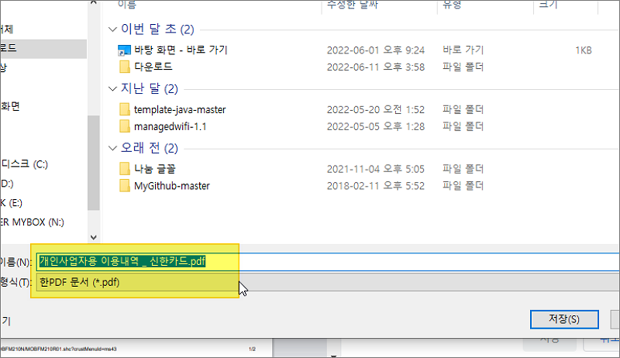▼ 파일 저장 팝업창에서 이름을 변경하고 형식이 PDF 인지 확인한 후 적당한 곳에 저장합니다.