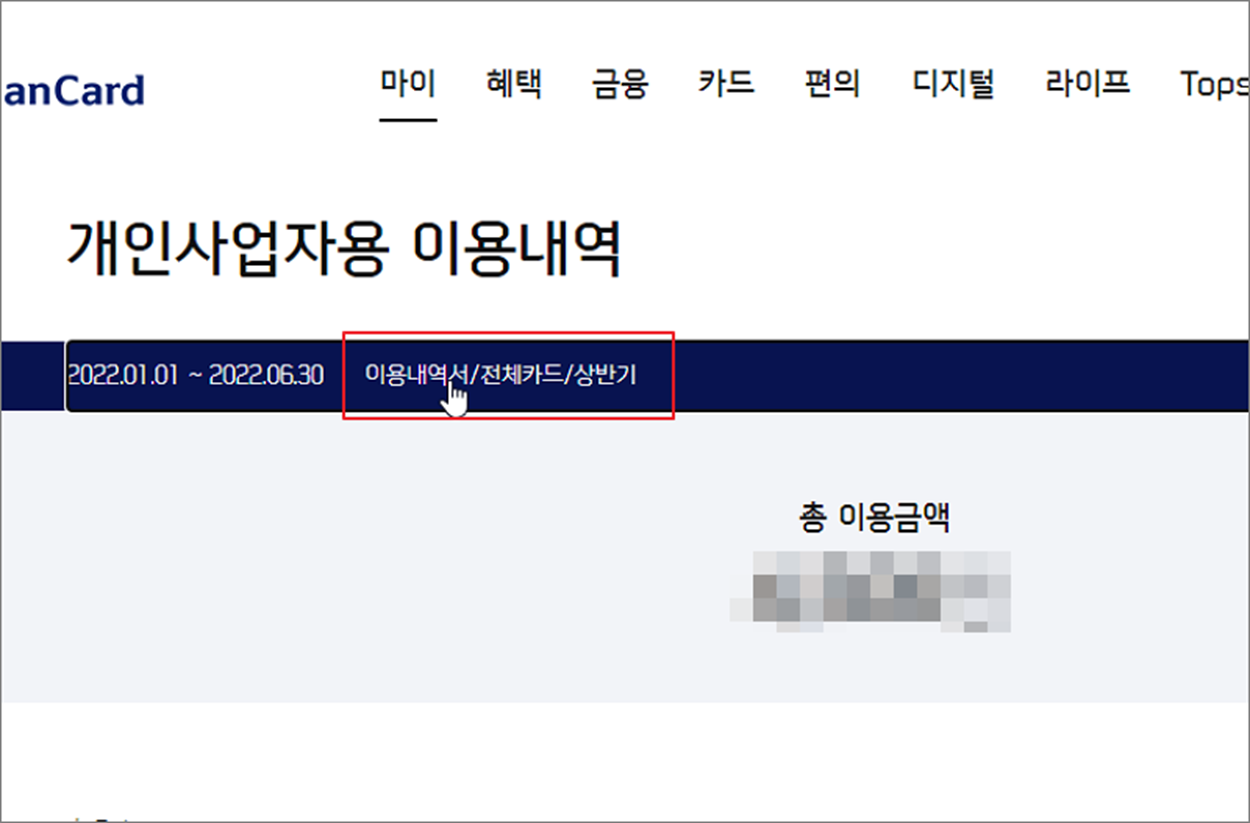 ▼ 로그인을 끝내면 개인사업자용 이용내역 페이지로 이동하는데, 최근 6개월치 사용 내역이 목록으로 나타납니다. 종합소득세 신고를 위해서는 작년 1월부터 12월까지의 이용내역이 필요합니다. 그래서 조회 조건을 바꿀 필요가 있습니다. 상단 날짜 옆 이용내역서/전체카드/상반기 메뉴를 클릭합니다.