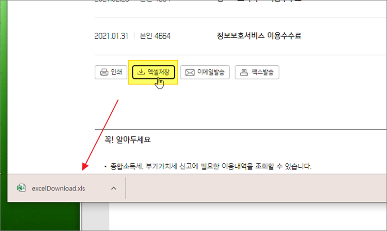 ▼ 이제 종합소득세 신고를 위해 조회 결과를 다운받아 보겠습니다. 먼저 엑셀 파일로 받을 겁니다. 화면하단에 엑셀저장 버튼을 클릭해서 카드 이용내역이 들어가 있는 엑셀 파일을 다운받습니다.