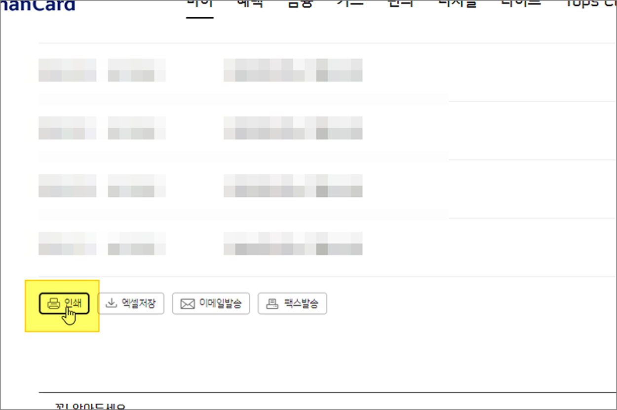 ▼ 다음은 카드 사용 내역을 PDF 파일로 다운받는 방법입니다. 화면 하단에 인쇄 버튼을 클릭합니다.