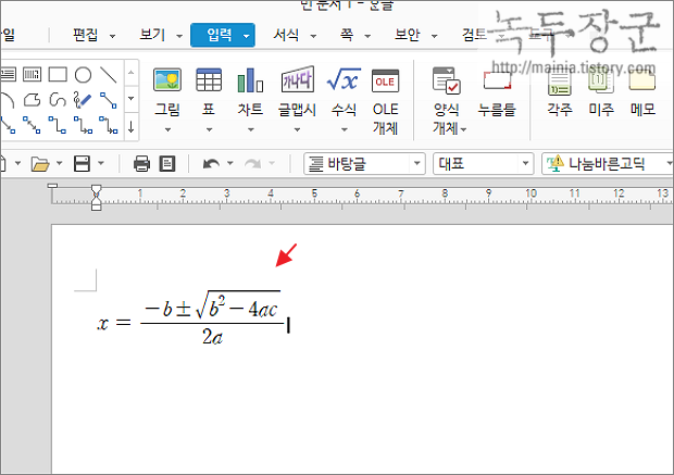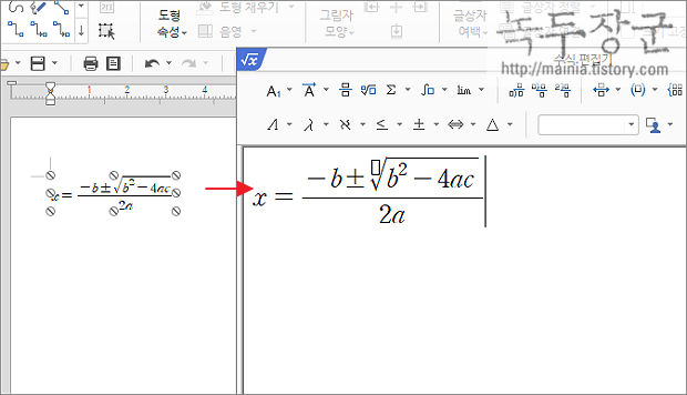 ▼ 한글의 수식편집기를 이용해서 아래 그림과 같이 루트가 들어간 수식을 만들어 보겠습니다. 루트와 분수가 들어간 흔히 쓰이는 방정식이죠. 이정도를 작성할 수 있다면 다른 어떤 어려운 수식이라도 가능할 것입니다.