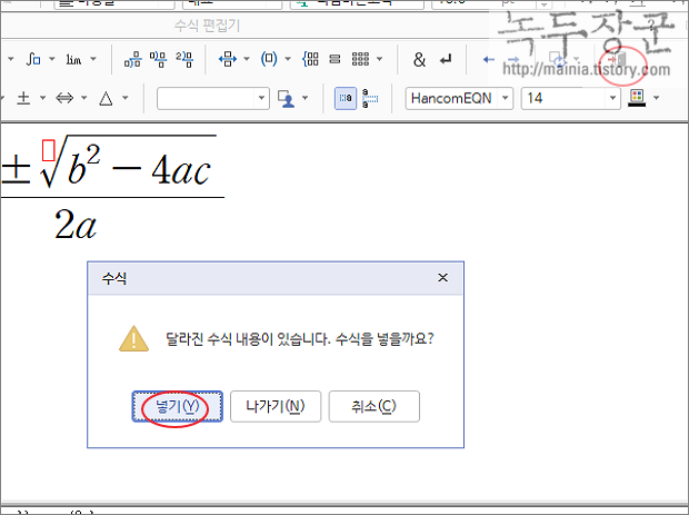 ▼ 이렇게 화면에 수식샘플을 추가한 뒤 더블 클릭해서 수식편집기 대화상자를 띄웁니다. 그리고 자신이 원하는 형태로 수정하시면 되겠죠.
