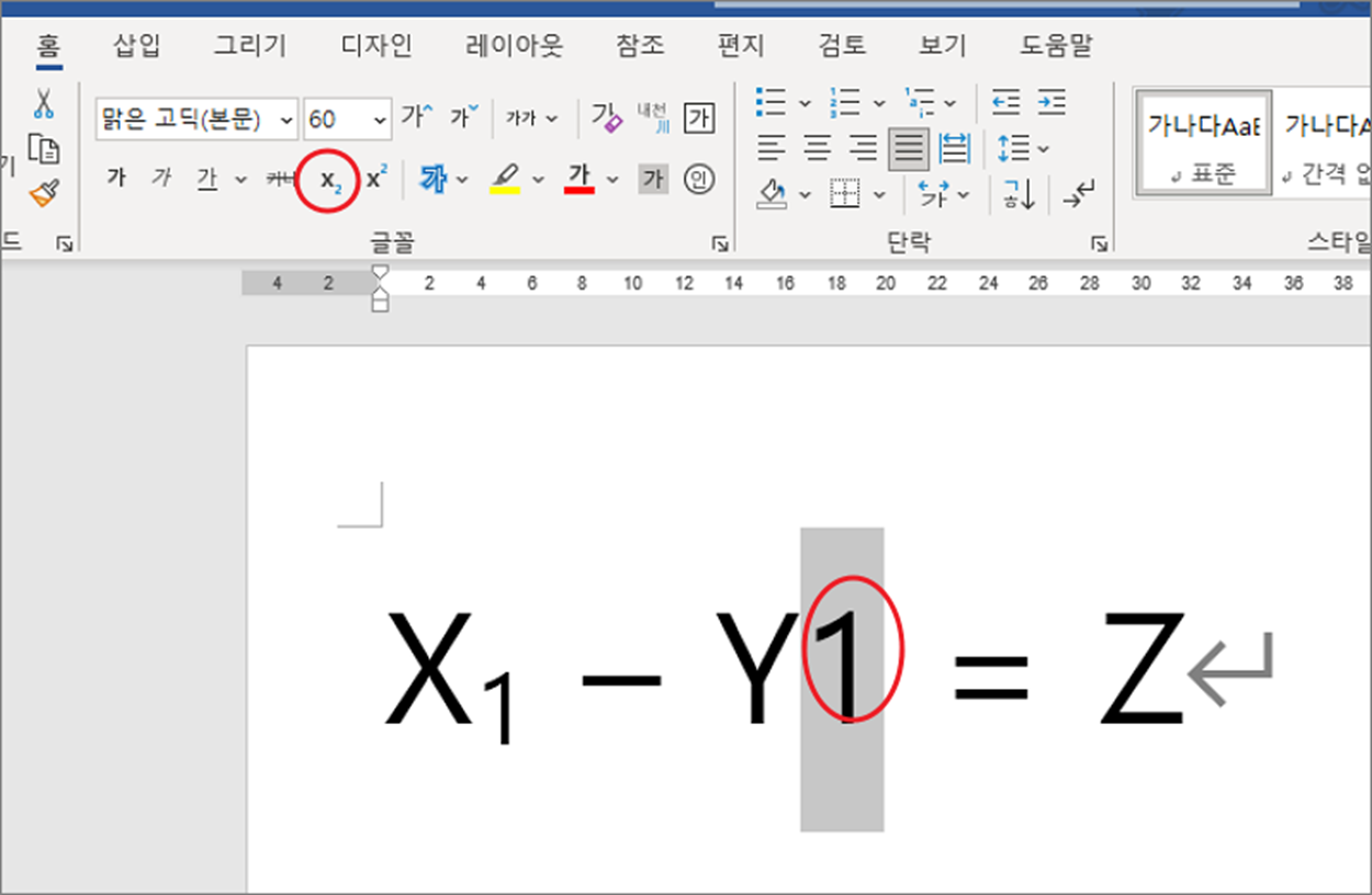 ▼ 글꼴 대화상자가 아닌 리본 메뉴에서도 아래 첨자를 추가할 수 있습니다. 아래 첨자 리본 메뉴는 위첨자 바로 옆에 위치해 있습니다. 선택하고 클릭하시면 바로 적용이 됩니다.