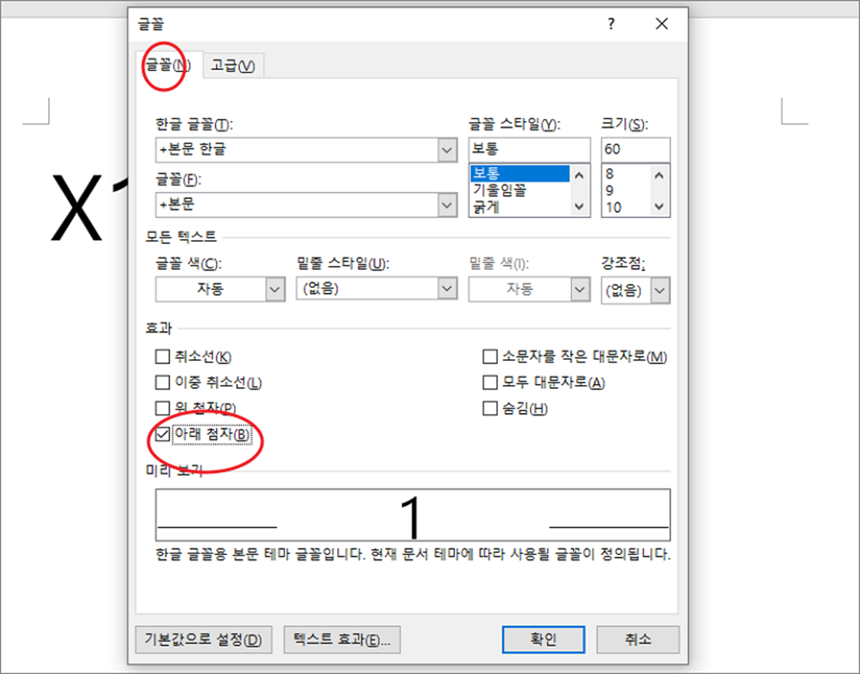 ▼ 글꼴 > 글꼴 탭으로 이동한 후 효과 란에 가서 “아래 첨자” 를 체크합니다.