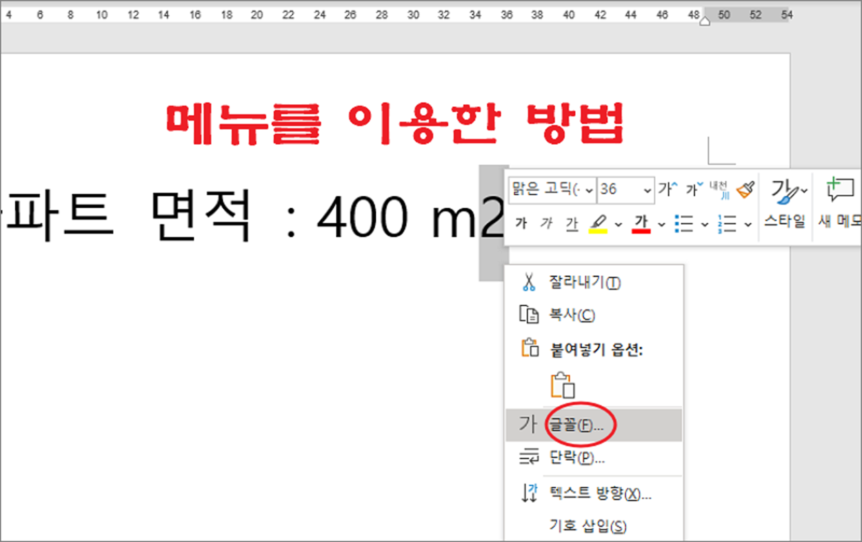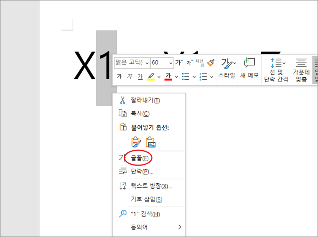 ▼ 화면에 뜬 빠른 실행 메뉴 중 “글꼴” 을 선택합니다.