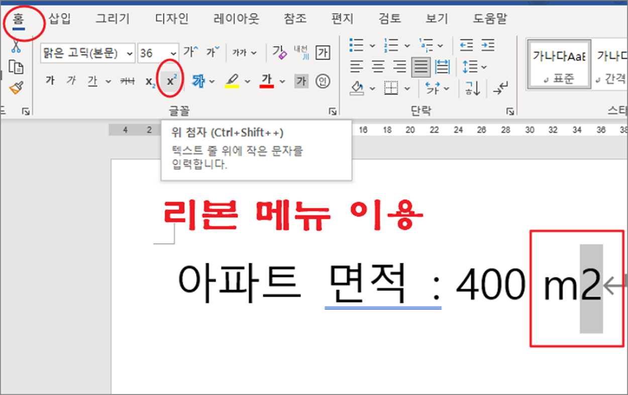 ▼ 글꼴 메뉴를 통해서 좀 더 빠르게 적용하는 방법도 있습니다. 두 단계를 거치지 않고 클릭 한번으로 위첨자를 만들 수 있습니다. 홈 탭 > 글꼴 그룹으로 가시면 X2 라는 리본메뉴가 있습니다. 적용할 숫자를 선택하고 클릭합니다.