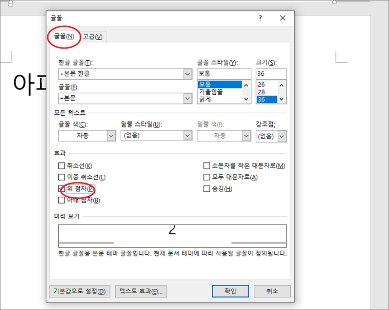▼ 글꼴 대화상자에서 글꼴 탭으로 이동합니다. 아래쪽으로 내려가면 “효과” 란이 있는데, “위 첨자” 를 체크합니다.