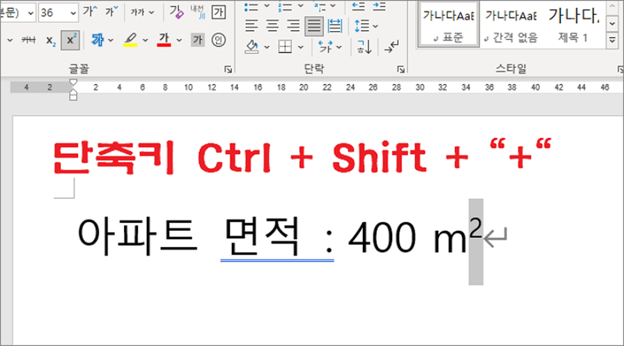 ▼ 이보다 더 간단한 방법은 단축키를 이용하는 것입니다. 위첨자의 단축키 [Ctrl] + [Shift] + [+] 입니다.