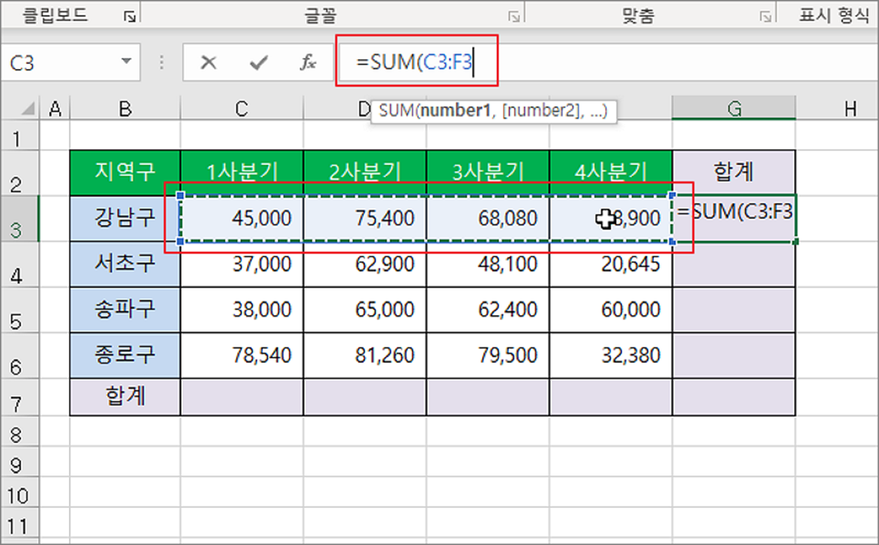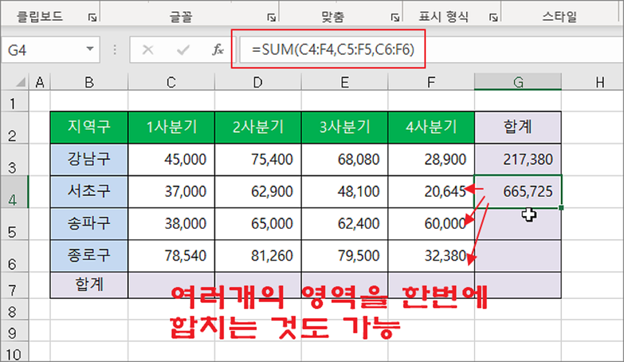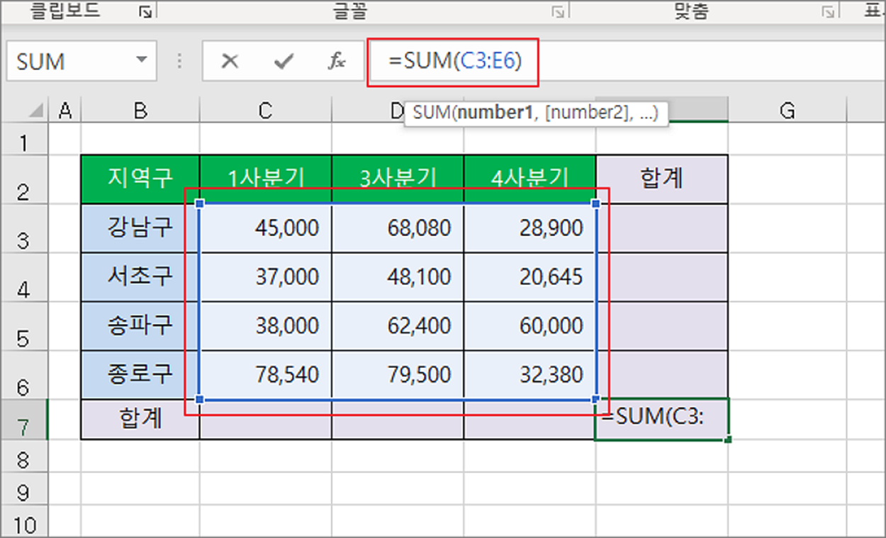 ▼ 또한 행/열을 합친 표 전체 영역을 입력해서 계산할 수도 있습니다. 표 전체 값을 한번에 합치고 싶을 때 SUM 함수의 매개변수로 영역을 지정합니다.