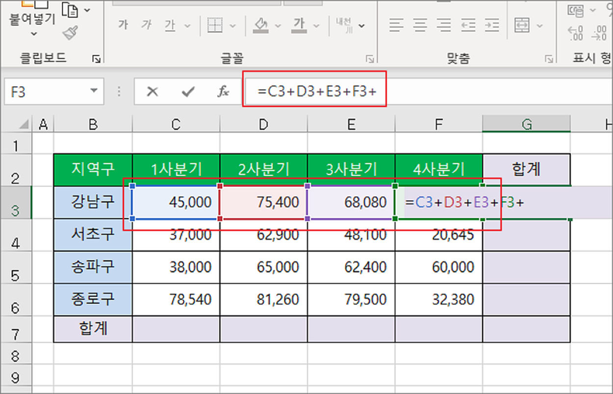 ▼ 두 번째 특징은 참조하는 수식의 업데이트에 있습니다. 두 행을 각각 + 기호와 SUM 함수를 이용해서 더하기 했습니다. 그리고 참조하고 있는 열을 삭제합니다.