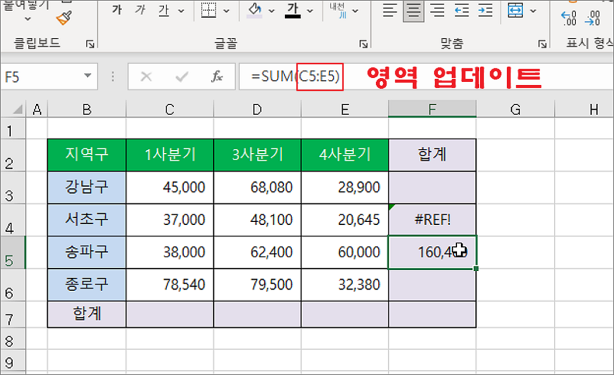 ▼ SUM 함수는 오류가 발생하지 않았습니다. 왜냐하면 참조한 주소가 자동으로 업데이트 되었기 때문입니다. 셀을 추가해도 마찬가지입니다.