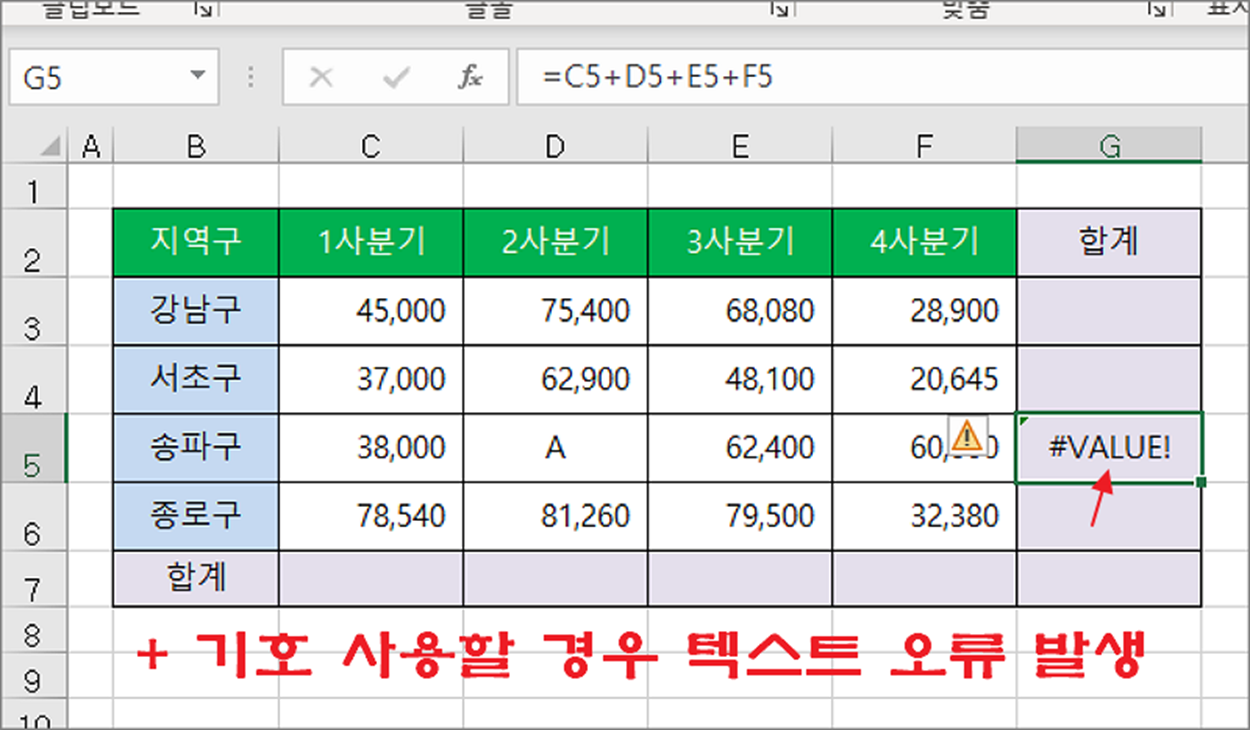 ▼ 이번에는 연산자 기호 + 를 사용하는 것보다 SUM 함수를 이용했을 때 어떤 장점이 있는지 알아보겠습니다. SUM 함수를 사용하면 영역에 계산이 불가능한 텍스트가 있을 때 제외하고 결과값을 반환합니다. 예를 들어 기호(+) 를 사용해서 더해 보겠습니다. 그림처럼 텍스트가 있는 경우 #VALUE! 오류가 발생했습니다.