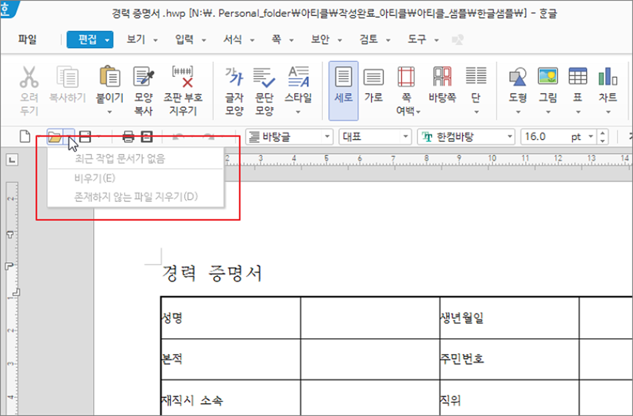 ▼ 결과는 다음과 같습니다. 최근 사용 문서를 모두 삭제했습니다. 하지만 한글을 다시 시작하면 이전 작업 문서는 목록에 나타납니다. 영구히 최근 사용 문서를 화면에 표시하지 않기 위해서는 설정을 변경해야 합니다.