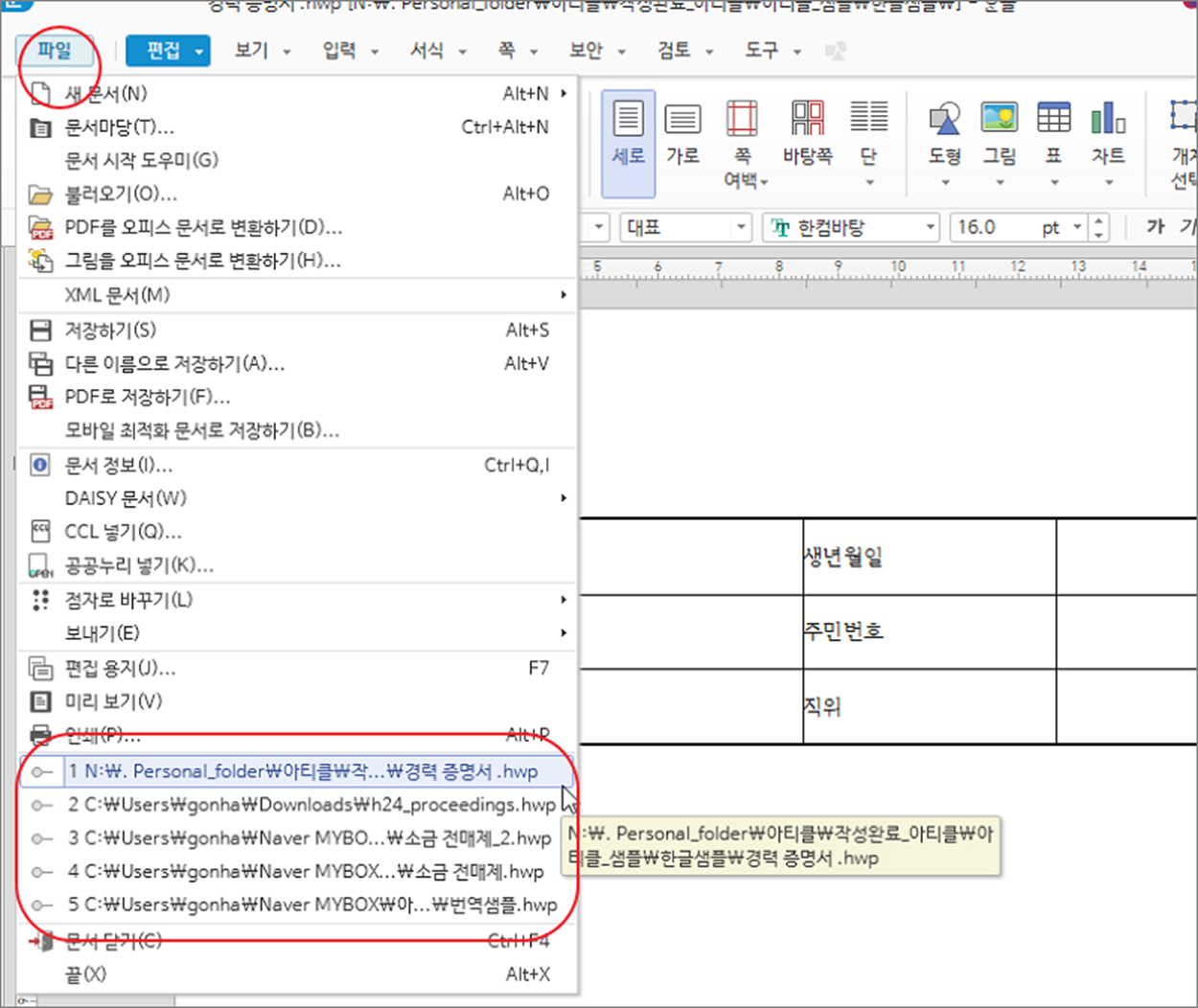 ▼ 두 번째는 한글을 시작하고 파일 메뉴에서 확인할 수 있습니다. 파일 메뉴 아래로 내려가면 최근 사용 문서 목록이 나타납니다.