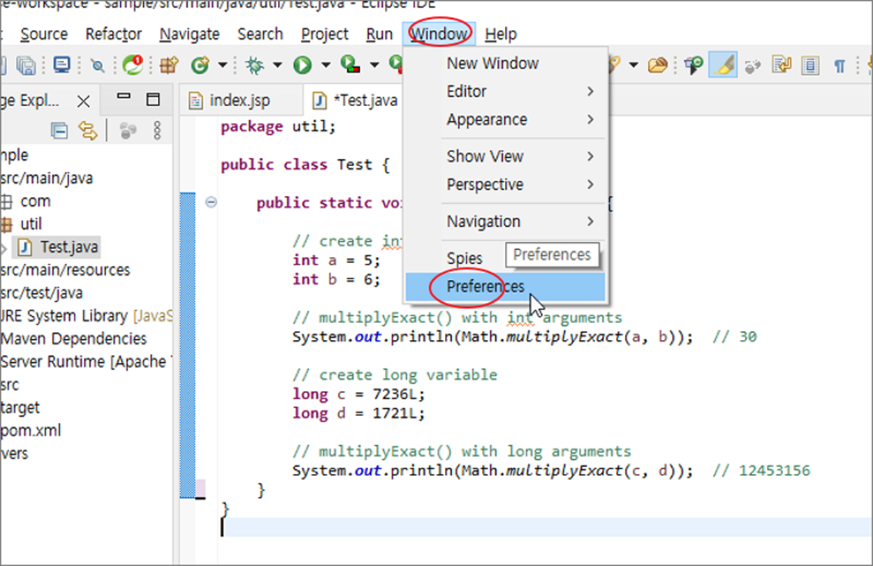 ▼ 이클립스에서 Windows > Preferences 메뉴를 선택해서 설정창을 띄웁니다.