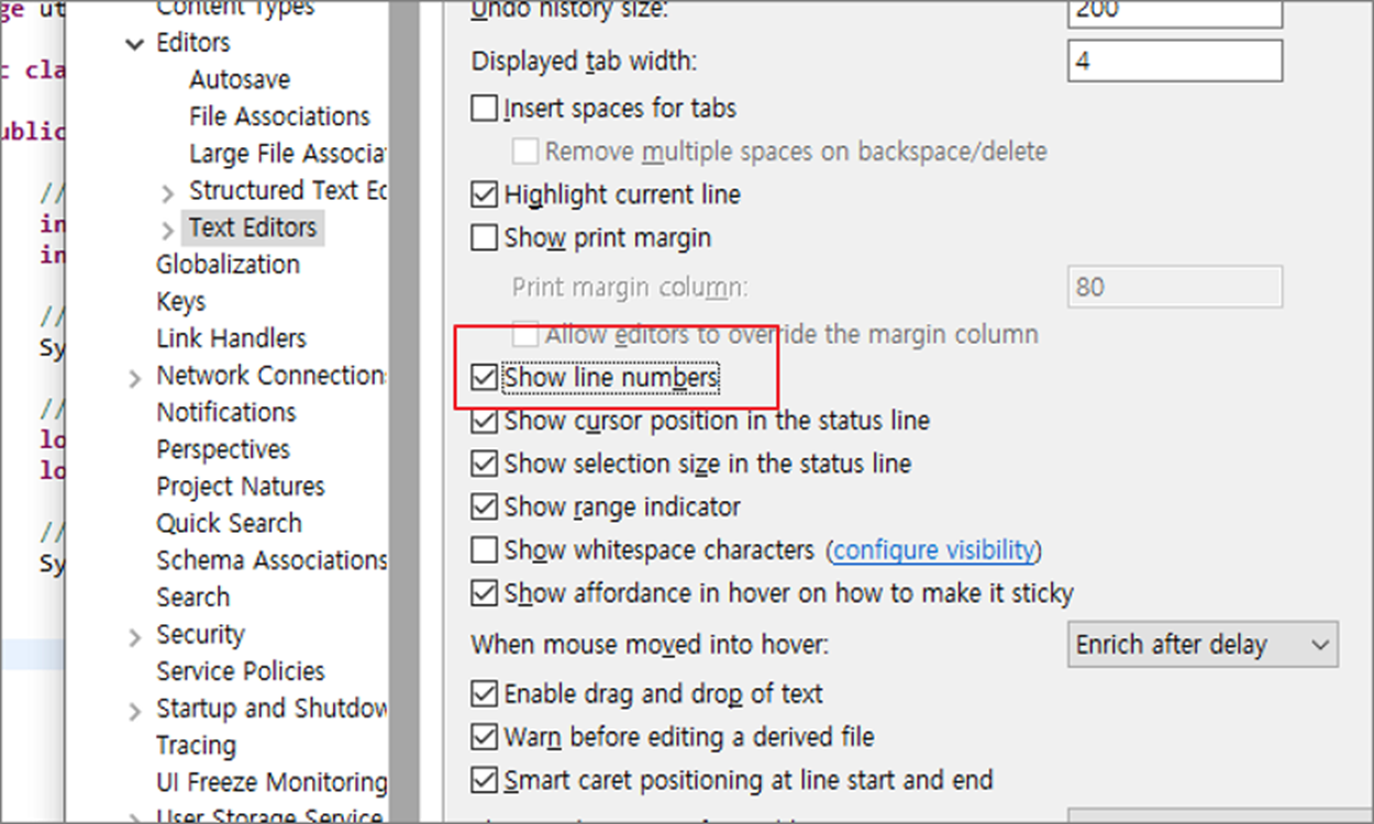 ▼ 아래 그림과 같이 Show Line Numbers 체크하면 라인이 나타납니다.