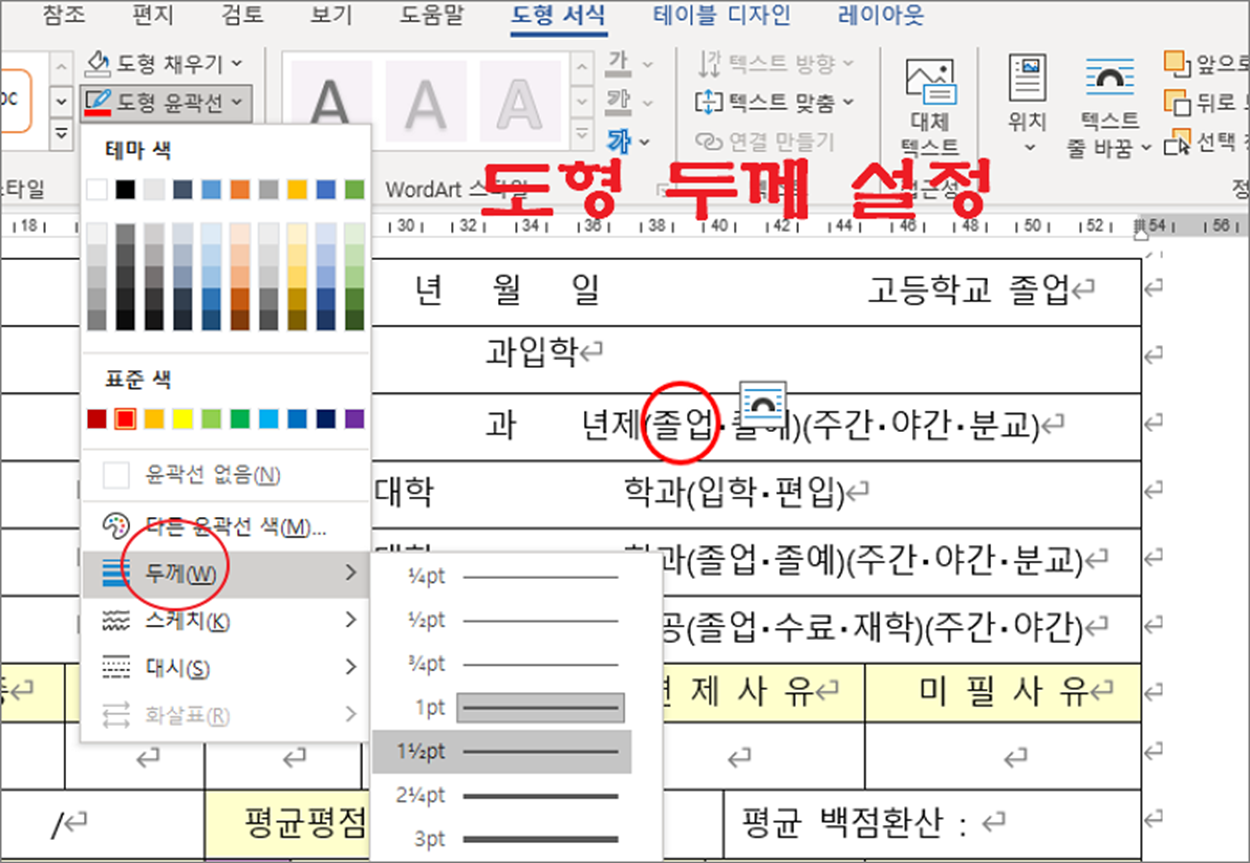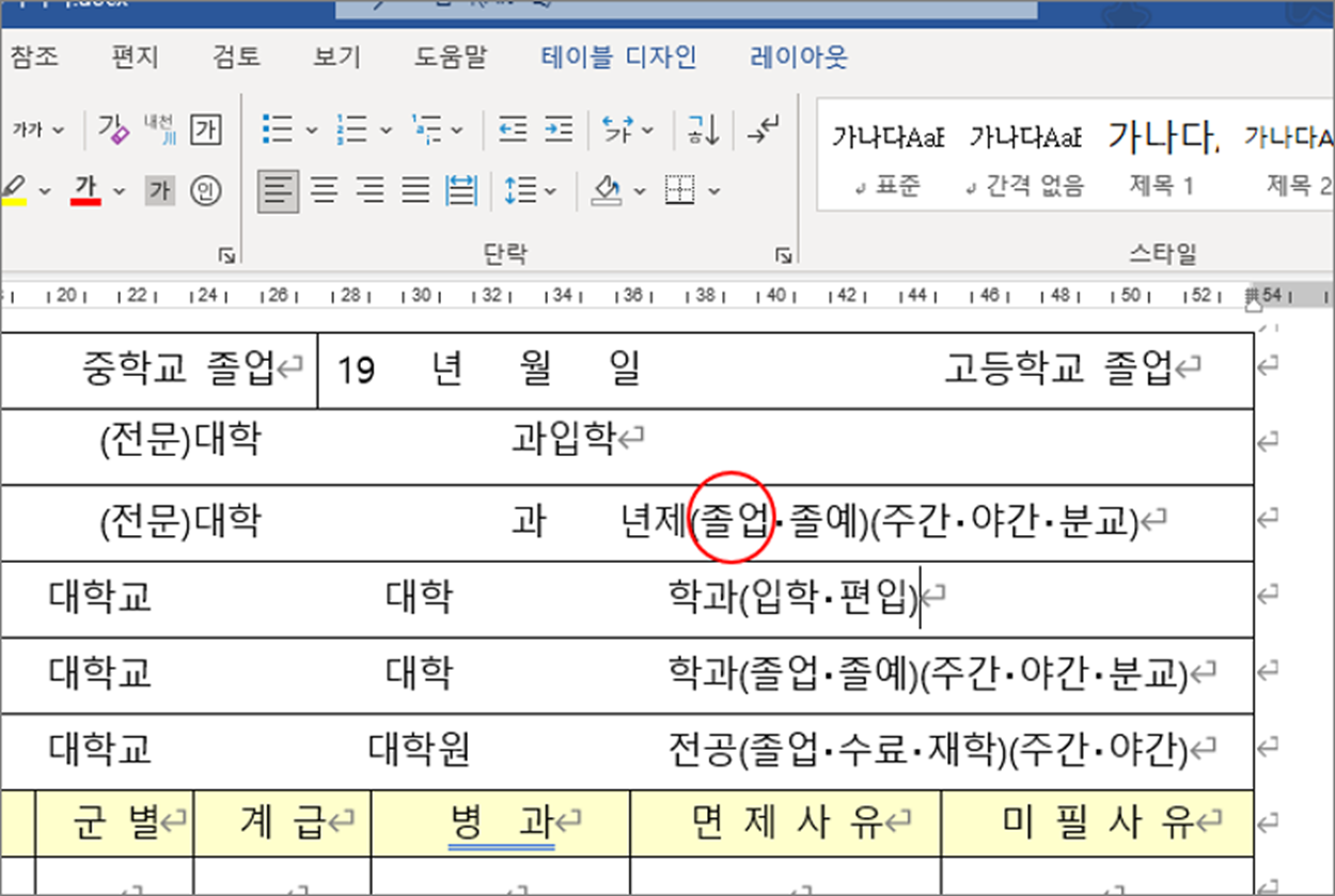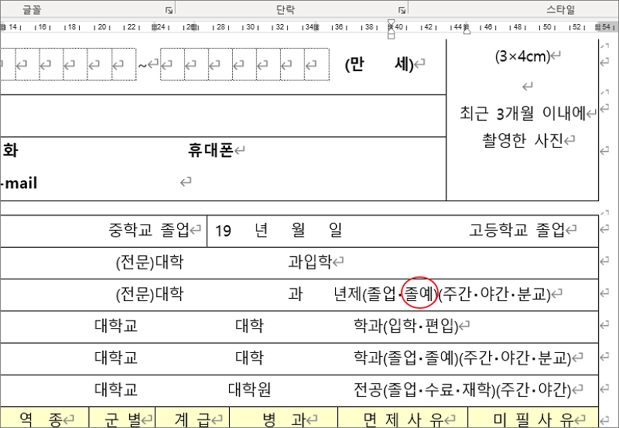 ▼ 아래 그림과 같이 이력서 작성에서 재학과 졸업, 졸예 중 하나를 선택해서 표시해야 합니다. 선택 항목에 동그라미를 표시해 보겠습니다.
