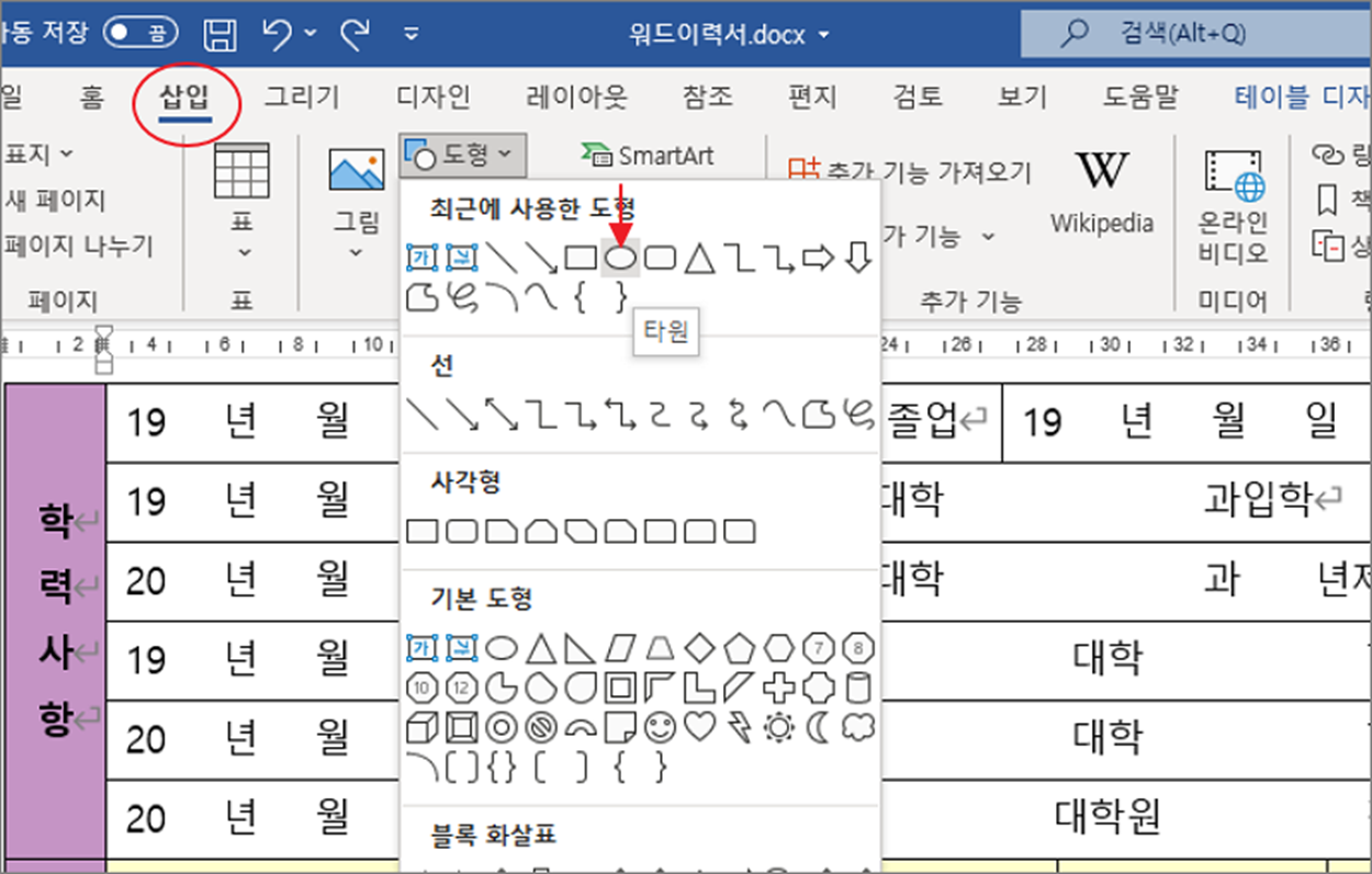 ▼ 삽입 탭 > 일러스트레이션 그룹 > 도형 리본 메뉴를 클릭합니다. 도형 목록에서 “타원” 화면에 추가 합니다.