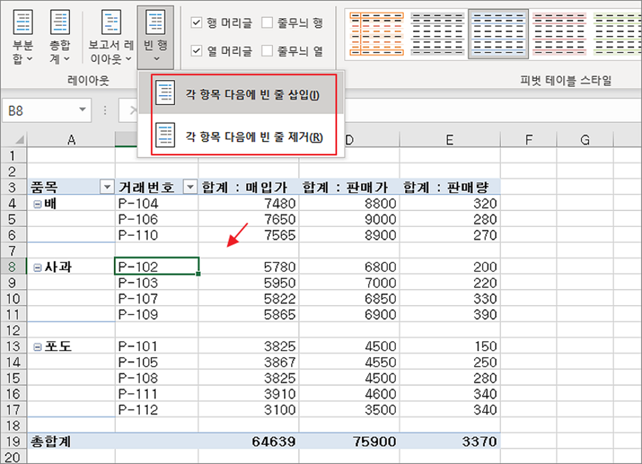 ▼ 마지막으로 빈 행 리본메뉴는 가독성을 위해 각 그룹별로 다음 행에 빈 줄을 삽입할 것인지 선택하는 옵션입니다. 기본은 빈 줄이 없습니다.