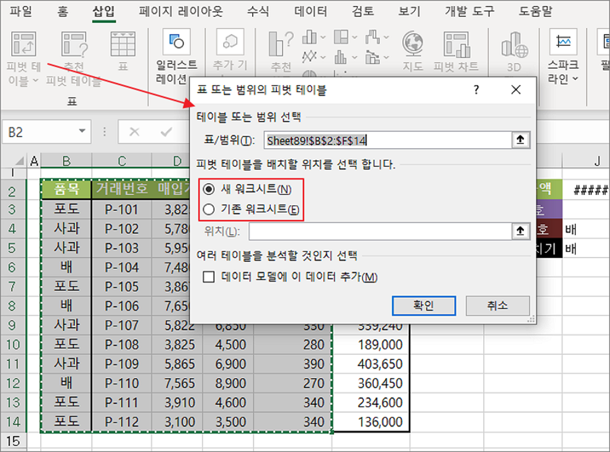 ▼ 삽입 > 피벗 테이블 리본 메뉴를 클릭해서 피벗 테이블 생성 대화상자를 띄웁니다. “표/범위” 항목은 이전에 선택한 영역입니다. 바로 옵션에서 피벗 테이블을 새 워크시트에서 띄울지 결정합니다.