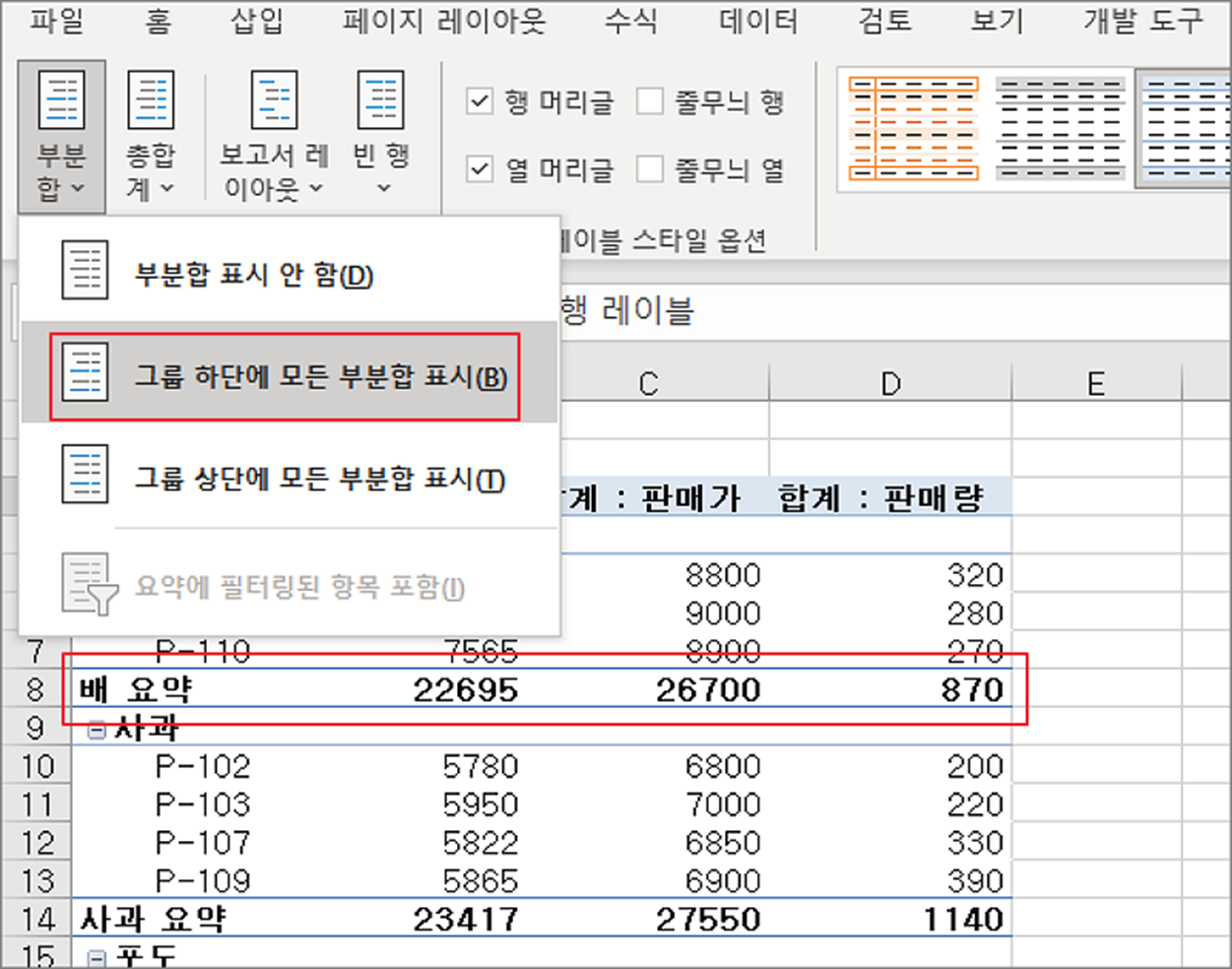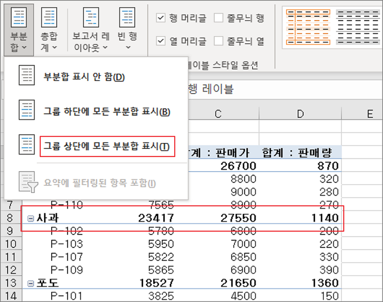 ▼ 두 번째 옵션인 “그룹 상단에 모든 부분합 표시” 는 하단이 아닌 그룹 타이틀이 있는 행에 합계값을 표시합니다.