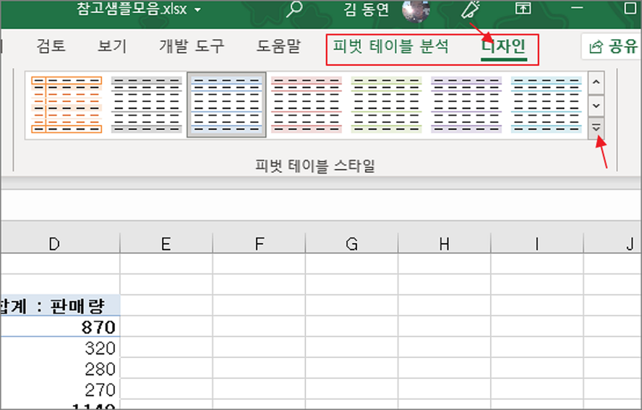 ▼ 피벗 테이블을 선택하면 상단에는 피벗 테이블 분석, 디자인 탭이 나타납니다. 디자인 탭에서 피벗 테이블 스타일을 화살표를 클릭해 보세요.
