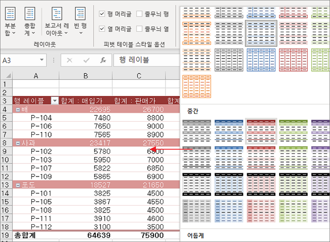 ▼ 펼쳐진 피벗 테이블 스타일 목록에는 다양한 형태의 디자인이 있습니다. 목록에서 선택한 디자인은 왼쪽 피벗 테이블에 바로 적용되므로 바로 확인이 가능합니다.