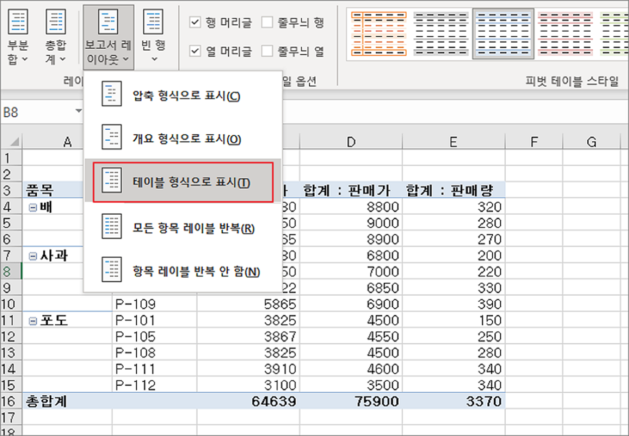 ▼ 보고 레이아웃 리본 메뉴는 표시 형식을 변경하는 옵션입니다. 기본은 압축 형식 입니다.